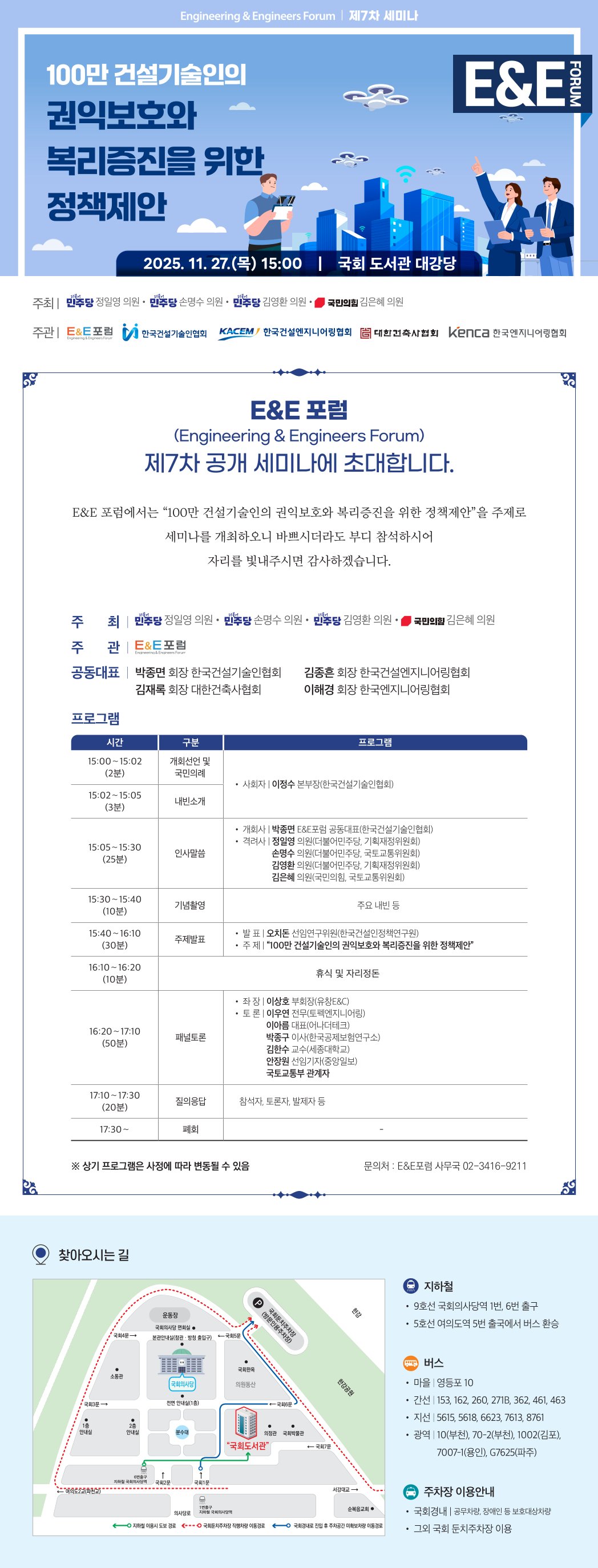 1. 4개토토사이트(토토핫토토 사이트토토사이트, 토토핫건설기술인토토사이트, 대한건축사토토사이트, 토토핫엔지니어링토토사이트) 공동으로 구성된 ‘E&E포럼’에서 ‘25.11.27(목) 15시 “100만 건설기술인의 권익보호와 복리증진을 위한 정책제안”이라는 주제로 제7차 세미나를 개최합니다.2. 해당 세미나 개최계획을 다음과 같이 안내하오니, 많은 분들의 적극적인 관심과 참여를 요청드리며, 붙임에 따른 참석통보서를 ‘25.11.20(목)까지 우리토토사이트 건설기술실 [E-mail :eng@keysanders.com]로 통보하여주시면 감사하겠습니다. - 다 음 - 가. 일 시 : 2025. 11. 27(목), 15:00 나. 장 소 : 국회 도서관 대강당 다. 주 최 : 정일영 의원, 손명수 의원, 김영환 의원, 김은혜 의원 라. 주 제 : 100만 건설기술인의 권익보호와 복리증진을 위한 정책제안 마. 프로그램 : “붙임 참조” ※ 참석 인센티브 : 특급건설기술인(설계·시공) 계속교육 학점 인정(시간당 2학점)※ 국회 출입 관련 "신분증" 필수 지참붙임 : 1. E&E포럼 제7차 세미나 초대장 1부. 2. E&E포럼 제7차 세미나 포스터 1부. 3. 참석통보서 1부. 끝.