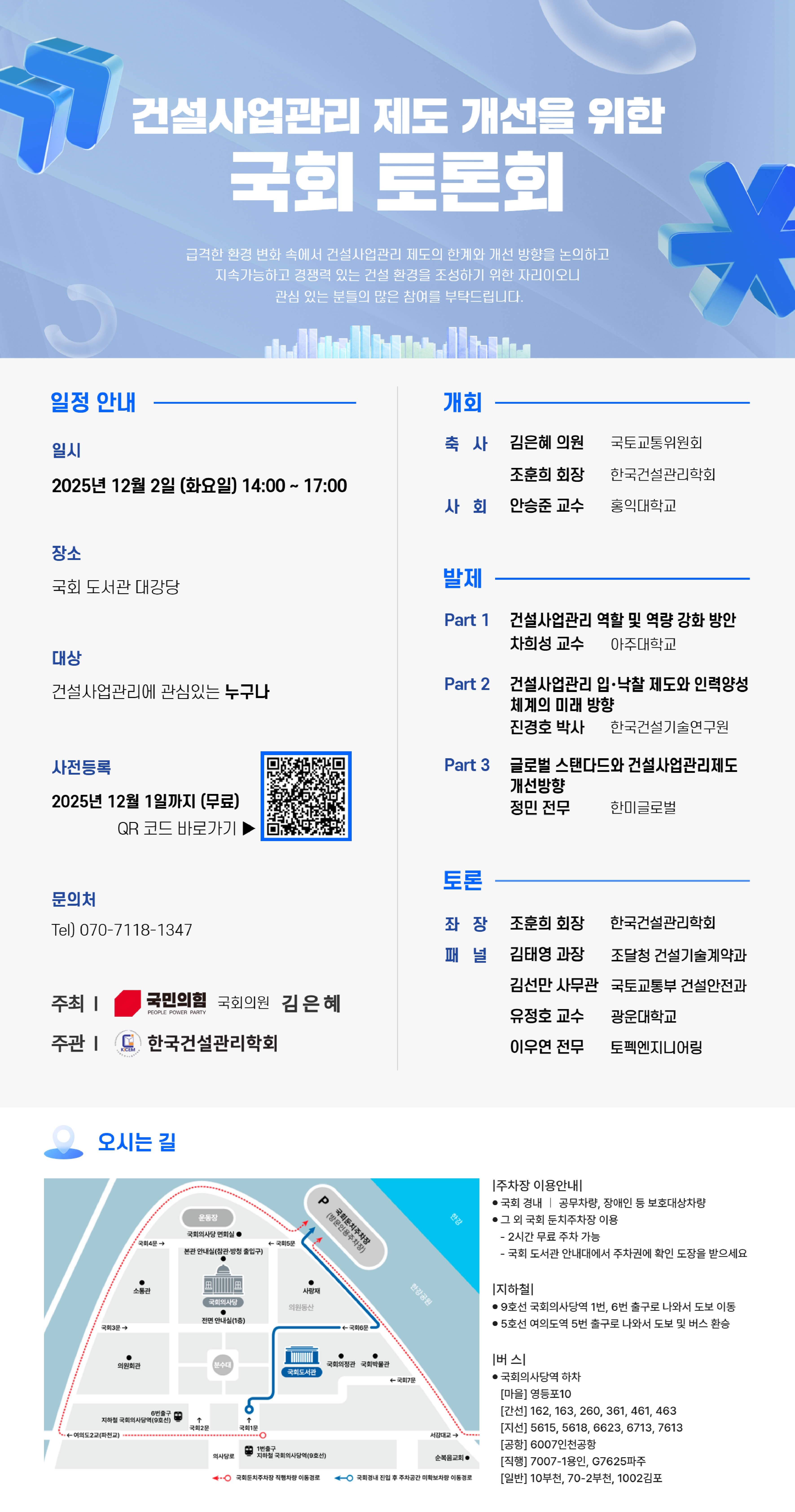 | 토토사이트 은행 조회건설관리학회는 건설산업의 투명성, 전문성, 효율성을 제고하고지속가능한 경쟁력 있는 건설환경 조성을 위한 토론회를 개최하여 안내드립니다. - 아 래 -가. 일시 : 2025년 12월 2일(화), 14:00~17:00나. 장소 : 국회 도서관 대강당다. 주최 : 국민의힘 김은혜 의원다. 주관 : 토토사이트 은행 조회건설관리학회붙 임 : 건설사업관리 제도 개선을 위한 토론회 안내문 1부. 끝. |
