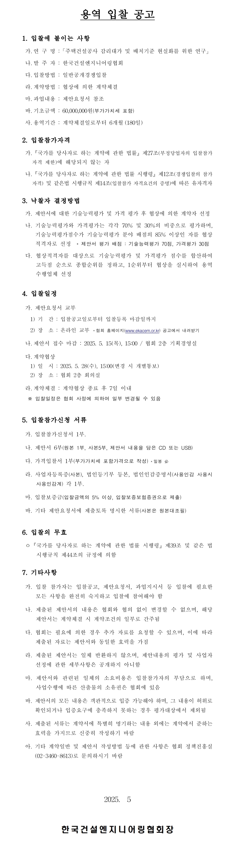 「주택건설공사 감리대가 및 배치기준 현실화를 위한 연구」 재입찰 공고 |